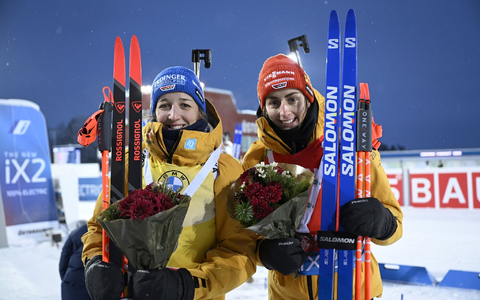 03.12.2023 - 17:09:54 | dpa.deZur Krönung des besten deutschen Biathlon-Starts der Geschichte ließen sich Franziska Preuß und Philipp Nawrath schon wieder jubelnd auf dem Podest feiern - und das auch noch in ihren Gelben Trikots.