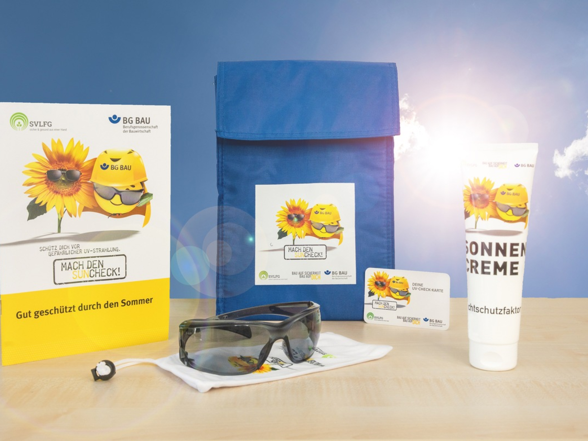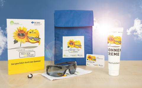 Die UV-Schutzpakete beinhalten je eine Kühltasche, eine UV-Schutzbrille, wasserfeste UV-Schutzcreme und Informationsmaterial. Mit den UV-Schutzpaketen will die BG BAU den steigenden Zahlen von Hautkrebs entgegenwirken und alle am Bau Beteiligten sensibilisieren.