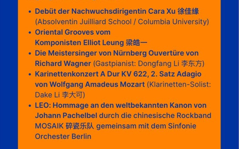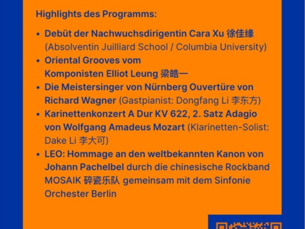 Berlin und Beijing verbindet eine langjährige Städtepartnerschaft. Mit einem besonderen kulturellen Highlight wird der Austausch gefeiert: Klassiker von Brahms, Mozart und Wagner treffen auf die legendäre chinesische Rockband MOSAIK Band. Die Veranstaltung wird von der chinesischstämmigen Berlinerin und Unternehmerin Prof. Yu Zhang, in ihrer Funktion als Präsidentin der Gesellschaft für Deutsch-Chinesischen kulturellen Austausch e.V. (GeKA), organisiert.
