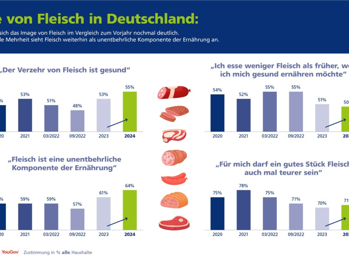 Der bereits rückläufige Fleischkonsum pro Kopf wird sich voraussichtlich auch in den nächsten Jahren fortsetzen. Das schätzen zumindest mehr als die Hälfte aller Haushalte. Als Gründe für den Rückgang nennen sie Gesundheit (50 Prozent), Nachhaltigkeit (43 Prozent), eventuelle Steuererhöhungen wie eine Tierwohlabgabe (40 Prozent) sowie der allgemeine Preisanstieg (28 Prozent). Dennoch wollen 68 Prozent auch in drei Jahren noch regelmäßig Fleisch essen. Nachdem im Vorjahr das Image des tierischen Lebensmittels gerade die Talfahrt verlassen hatte, geht es seitdem bergauf. Insgesamt steigt die Wahrnehmung von Fleisch als unentbehrliche Komponente der Ernährung auf 64 Prozent (Sonderbefragung Inflation September 2022: 57 Prozent). Das ist der höchste Wert seit 2018. 2024 stimmen außerdem 55 Prozent der Deutschen der Aussage zu, dass der Verzehr von Fleisch gesund ist (2022: 48 Prozent) - 7 Prozentpunkte mehr als noch zwei Jahre zuvor.