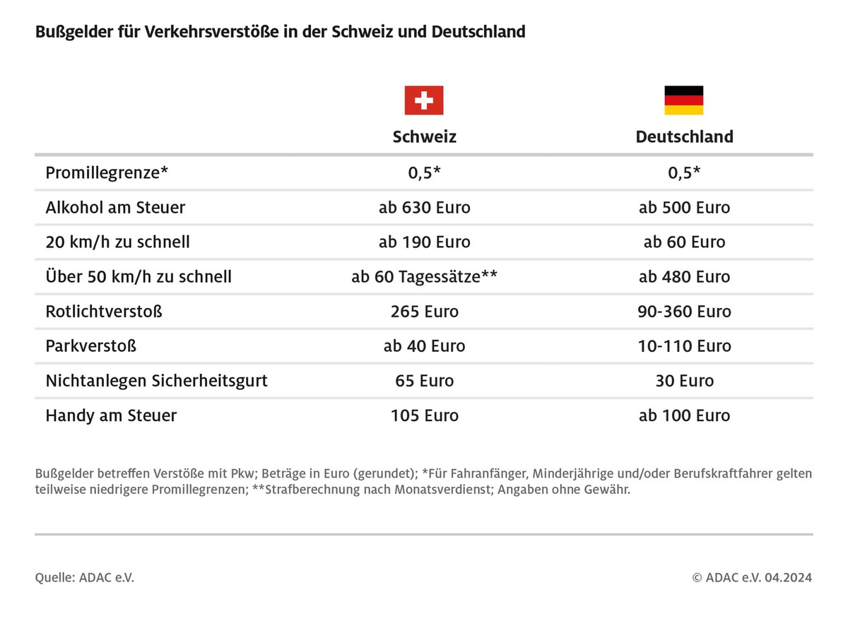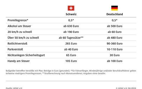 Die Schweiz ist bekannt für ihre hohen Geldbußen bei Verkehrsverstößen. Bei einer Geschwindigkeitsüberschreitung von 20 km/h beträgt das Bußgeld mindestens 190 Euro. Zum Vergleich: In Deutschland beginnen die Bußgelder hierfür ab 60 Euro. Bei einer Überschreitung von mehr als 50 km/h berechnet sich die Buße in der Schweiz nach Einkommen und es werden ab 60 Tagessätze fällig, in Deutschland hingegen ab 480 Euro. Bei Überschreitungen des Tempolimits um 80 km/h auf Autobahnen oder mehr als 40 km/h in Tempo 30-Zonen drohen im Nachbarland mindestens ein Jahr Gefängnis.