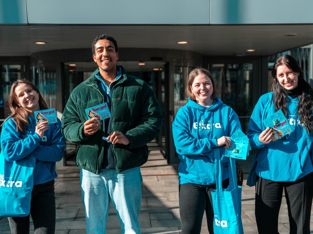Eine Postkarte mit den Lerntipps und einem Kaugummi-Sample werden in der heißen Prüfungsphase bis Ende Februar an den Unis und Hochschulen verteilt. Luis Newton war heute persönlich auf einem Uni-Campus - für eine kurze Lernpause mit EXTRA®.