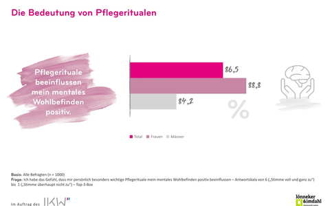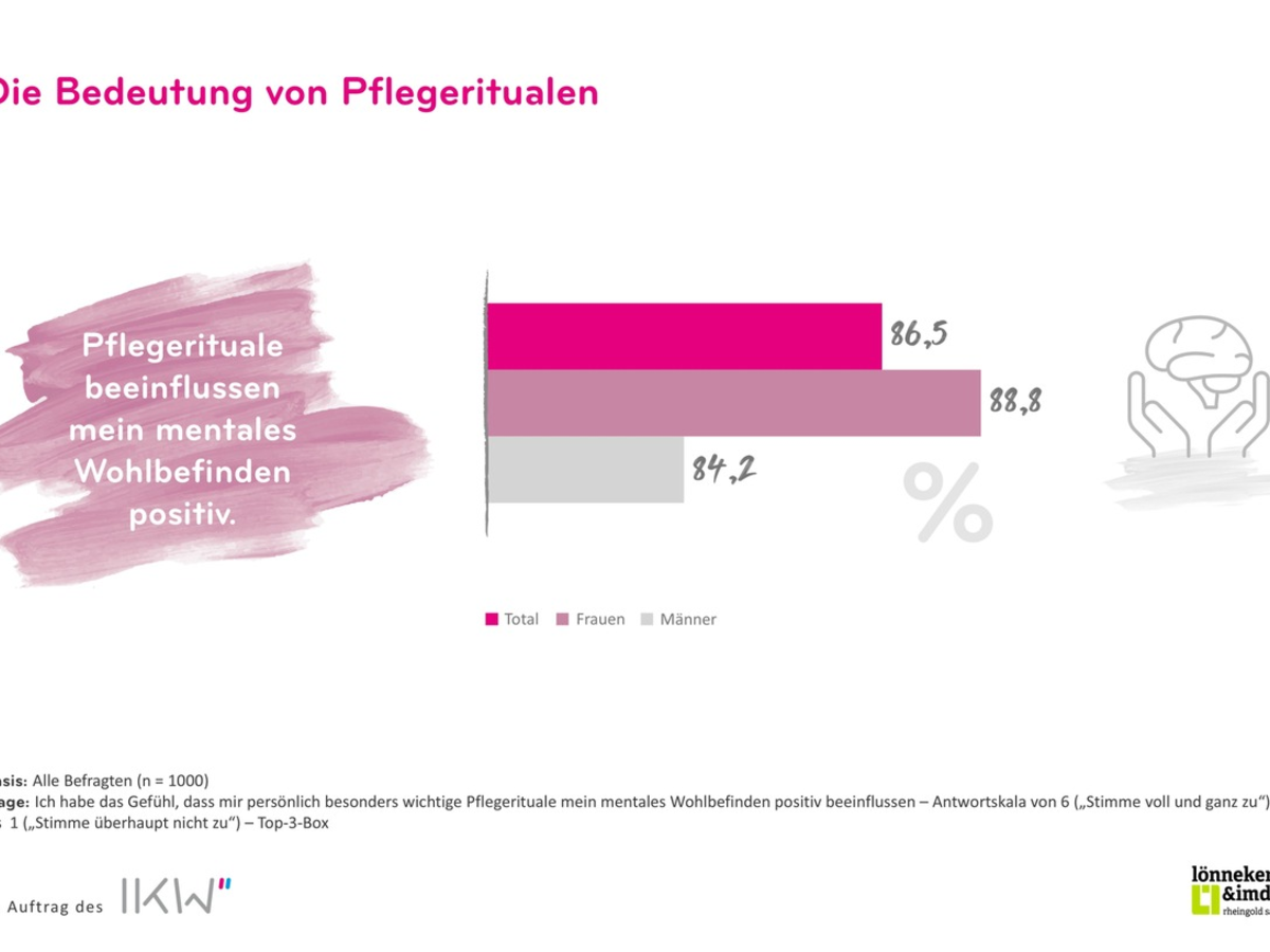 Viele nutzen kosmetische Pflegerituale und kosmetische Produkte intuitiv, um sich psychisch gesund zu halten. 33 % aller Befragten und 39 % der Frauen sagen, sie nutzen Körperpflege gezielt zur Stärkung ihrer mentalen Gesundheit. Rund 87 % der Befragten bestätigen, dass Pflegerituale ihr mentales Wohlbefinden positiv beeinflussen. Bei Frauen sind es sogar fast 89 %. Auf Platz eins der entspannenden Pflegerituale steht mit 75 % das Duschen. Auf Platz 2 folgt mit 47 % das Auftragen eines Duftes und auf Platz 3 mit 45 % das Eincremen. Deutlich mehr Frauen (48 %) ist die Gesichtspflege wichtig, dafür legen viele Männer (43 %) besonderen Wert auf die Rasur als Pflegeritual für mentales Wohlbefinden.