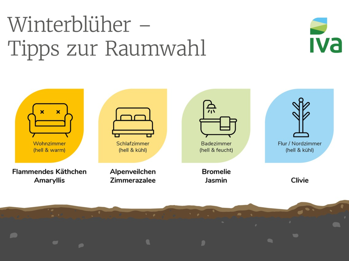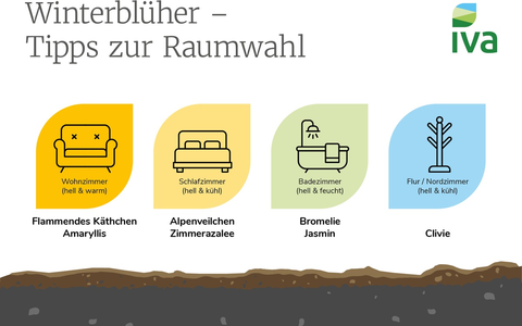 Für kühlere Räume wie Schlafzimmer eignen sich Zimmerazaleen oder Winterprimeln, die bei Temperaturen zwischen 15 und 18 Grad Celsius besonders lange blühen. Ergänzend empfiehlt der IVA weitere kälteverträgliche Winterblüher wie Alpenveilchen oder Winterprimeln, die ebenfalls helle, aber kühle Standorte bevorzugen.
