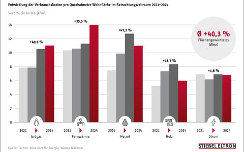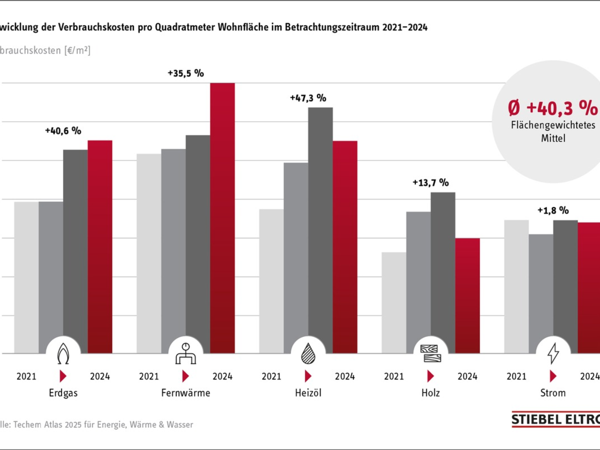 Die Verbrauchskosten für fossile Brennstoffe sind in den vergangenen Jahren dramatisch gestiegen, wie der "Techem Atlas 2025 für Energie, Wärme & Wasser" berichtet: Pro Quadratmeter Wohnfläche verteuerte sich der Preis für Erdgas von 2021 bis 2024 um insgesamt 40,6 Prozent, bei Heizöl waren es 47,3 Prozent. Der für den Antrieb einer Wärmepumpe erforderliche Strom hat sich laut der Studie mit einem Anstieg von 1,8 Prozent nur moderat verteuert.