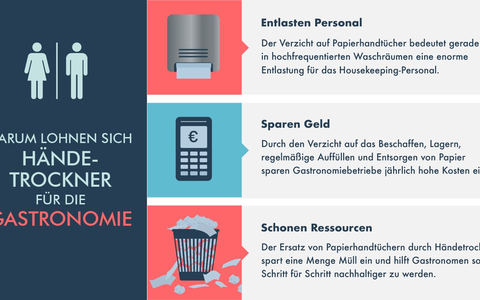 Indem Gastronomen dem Trend folgen und mit modernen Händetrocknern papierlose Waschräume schaffen, profitieren sie gleich von mehreren Vorteilen: Die Betriebskosten und der Housekeeping-Aufwand sinken, während sie gleichzeitig Ressourcen sparen und dazu beitragen, dass Bayern seine Klimaschutzziele erreicht.