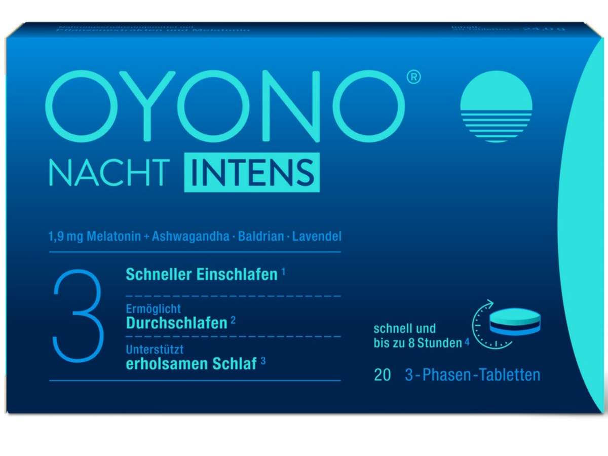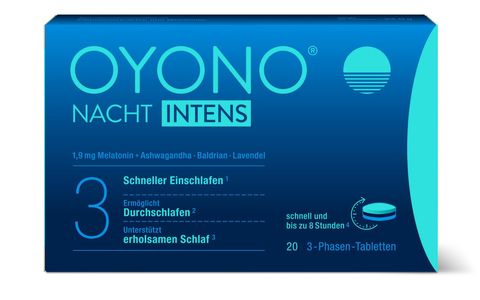 OYONO® ist besonders für seine innovativen 3-Phasen-Tabletten bekannt. Sie kombinieren verschiedene, ausgewählte Pflanzenextrakte mit dem körpereigenen Stoff Melatonin. Die Inhaltsstoffe werden nach der Einnahme zeitlich versetzt freigesetzt - sowohl zu Beginn als auch im Verlauf der Nacht - und unterstützen je nach Produkt bestimmte Aspekte des Schlafs. Schlafprobleme sind von Mensch zu Mensch sehr unterschiedlich. Der eine hat Schwierigkeiten beim Einschlafen, der andere leidet unter einem unruhigen, zu leichten und nicht erholsamen Schlaf. Auch das häufige Aufwachen in der Nacht, das einen erholsamen Schlaf verhindert, stellt für viele Betroffene ein großes Problem dar. Genau hier setzen die Produkte von OYONO® an. OYONO® NACHT INTENS unterstütz das Ein- und Durchschlafen, sowie einen erholsamen Schlaf.[1-3] Einschlafen, einen ruhigen Schlaf und eine normale Schlafqualität werden durch OYONO® NACHT unterstützt.[4-6]