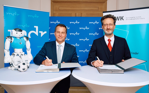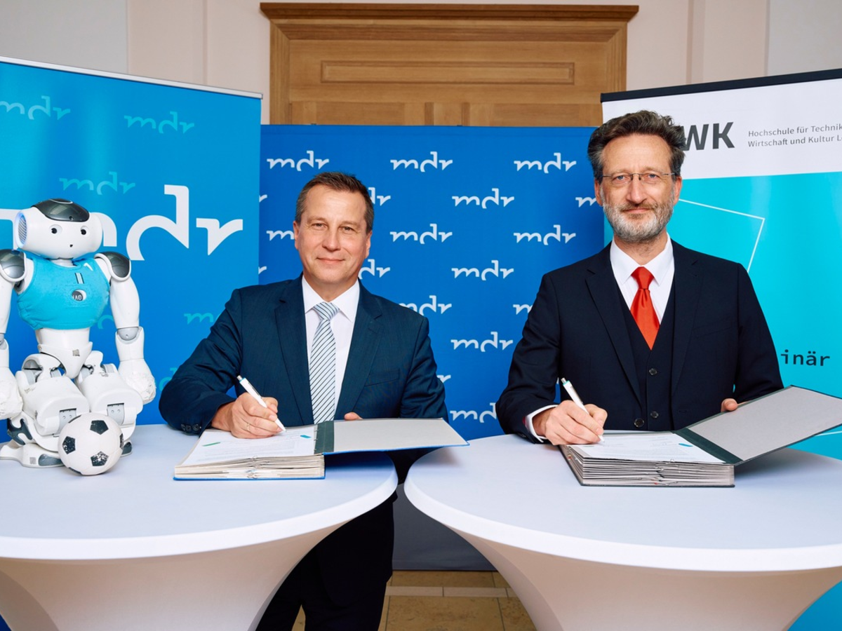 Die Hochschule für Technik, Wirtschaft und Kultur Leipzig (HTWK Leipzig) und der Mitteldeutsche Rundfunk (MDR) erneuern ihre langjährige Kooperation und wollen sich noch enger vernetzen. MDR-Intendant Ralf Ludwig und HTWK-Rektor Professor Dr.-Ing. Jean-Alexander Müller haben dafür heute (05.09.2025) in Leipzig einen Kooperationsrahmenvertrag unterzeichnet. Dieser sieht für die Zukunft einen regelmäßigen Austausch und die Entwicklung neuer gemeinsamer Projekte vor. Ziel ist es, Themen aus Wissenschaft und Bildung für ein breites Publikum gemeinsam stärker sichtbar zu machen und so die Aufmerksamkeit dafür zu erhöhen.