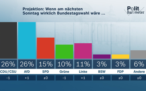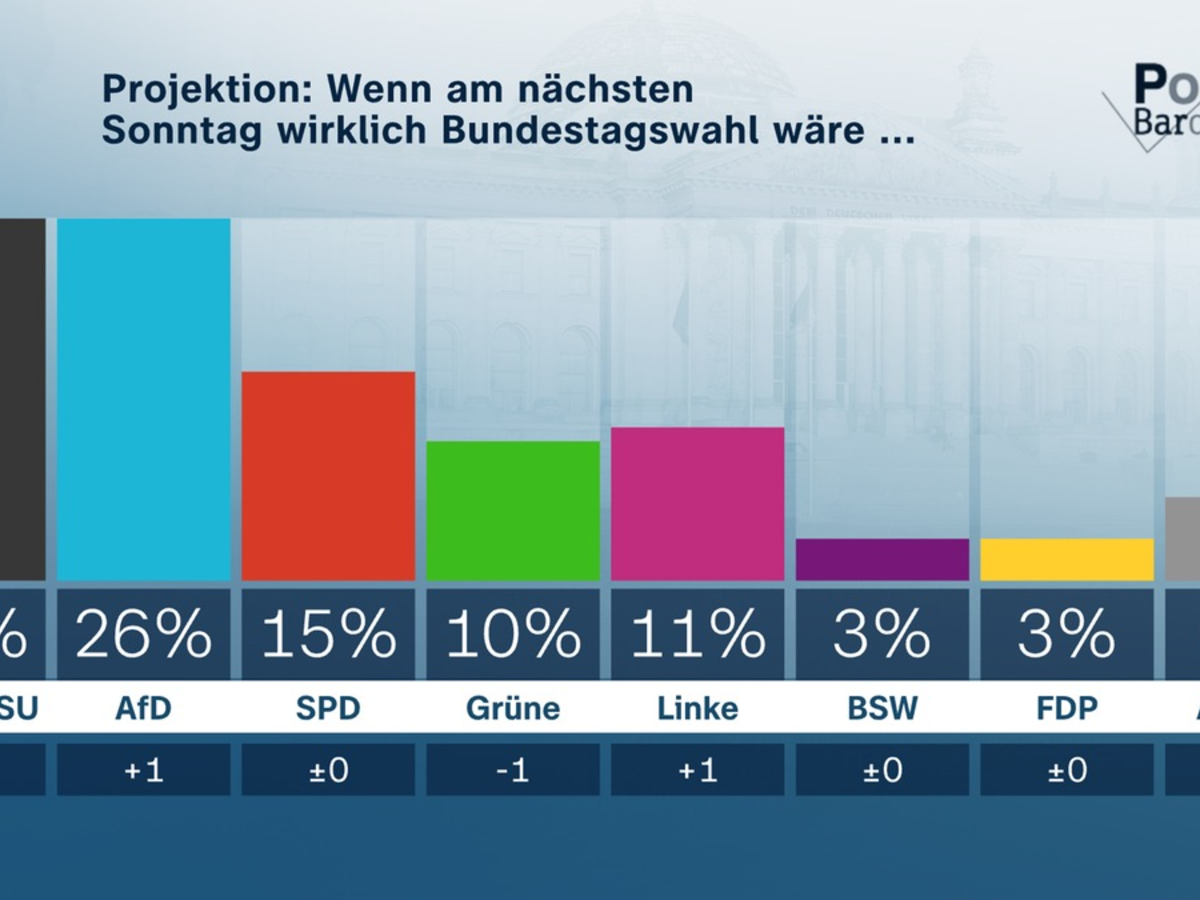 Die Umfrage zum Politbarometer wurde wie immer von der Mannheimer Forschungsgruppe Wahlen durchgefĂŒhrt. Die Interviews wurden in der Zeit vom 16. bis 18. September 2025 bei 1.419 zufĂ€llig ausgewĂ€hlten Wahlberechtigten telefonisch und online erhoben. Dabei wurden sowohl Festnetz- als auch Mobilfunknummern berĂŒcksichtigt. Die Befragung ist reprĂ€sentativ fĂŒr die wahlberechtigte Bevölkerung in Deutschland. Der Fehlerbereich betrĂ€gt bei einem Anteilswert von 40 Prozent rund +/- drei Prozentpunkte und bei einem Anteilswert von 10 Prozent rund +/-zwei Prozentpunkte. Daten zur politischen Stimmung: CDU/CSU 28 Prozent, AfD 21 Prozent, SPD 16 Prozent, GrĂŒne 14 Prozent, Linke 13 Prozent, BSW 2 Prozent, FDP 2 Prozent. Das nĂ€chste Politbarometer sendet das ZDF am Donnerstag, 2. Oktober 2025. Informationen zur Methodik der Umfrage und zu den genauen Frageformulierungen finden Sie auch auf www.forschungsgruppe.de.