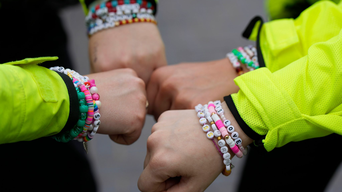 Swifts Fans verbreiteten positive Stimmung mit Glitzerpailletten, Fan-T-Shirts und FreundschaftsbĂ€ndchen. Die ArmbĂ€ndchen werden gebastelt und getauscht. Auch Karim (23) aus Erfurt brachte welche mit. Angereist ist er mit zwei Freunden aus Bayern, die er ĂŒber die Fangemeinde kennengelernt hat. Die Community sei wie eine Familie, sagt er. Sie halte zusammen. Auch nach den Ereignissen in Ăsterreich.