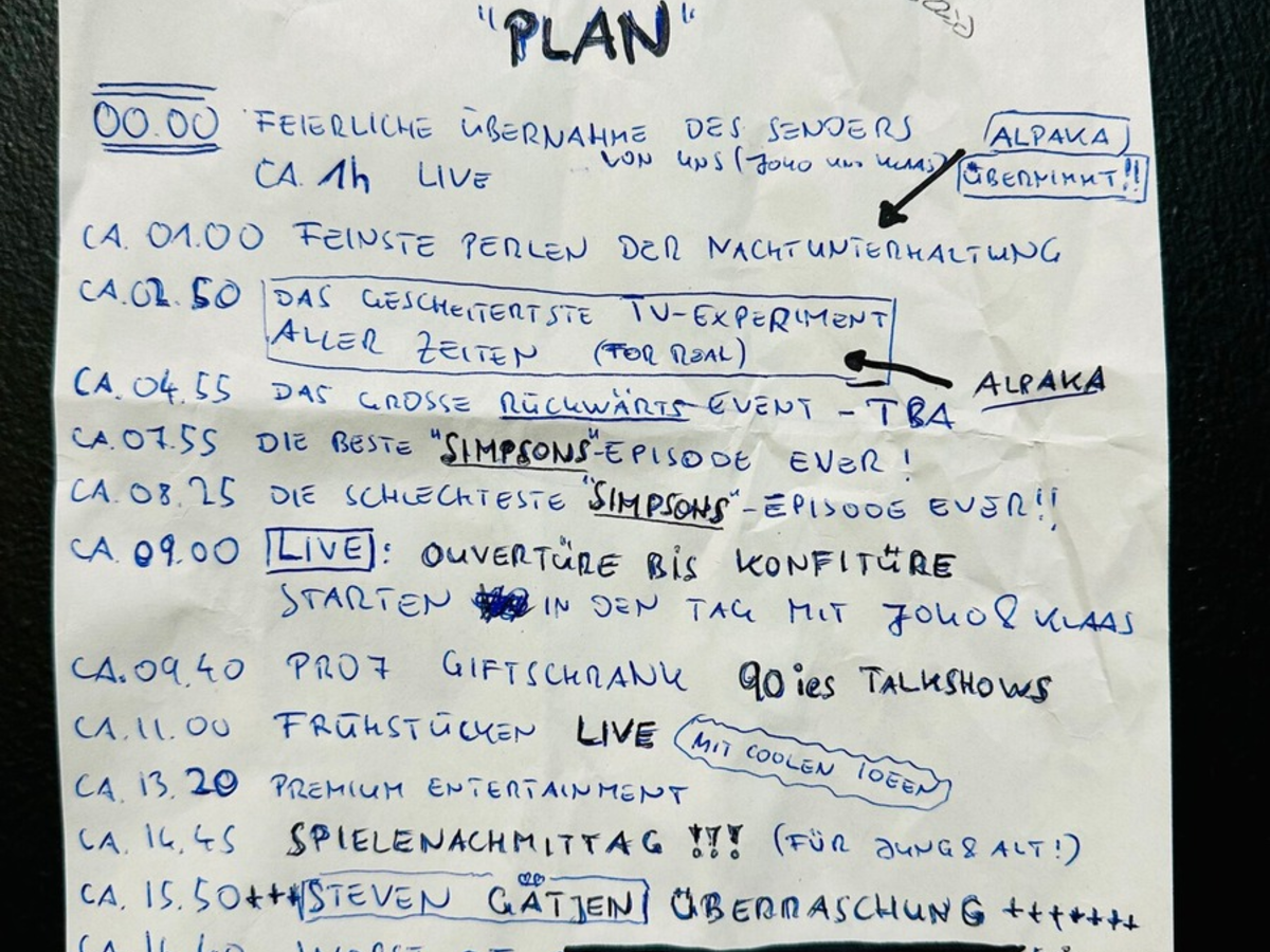 Auf mehrfache Nachfrage von ProSieben haben Joko & Klaas in ihrer Funktion als Programmdirektoren den Sonntag jetzt "geplant" und uns lediglich den im Anhang befindlichen "Programmzettel" zugestellt. Entsprechend ändert ProSieben das Programm mit Überraschungen am Sonntag, 21. April 2024.