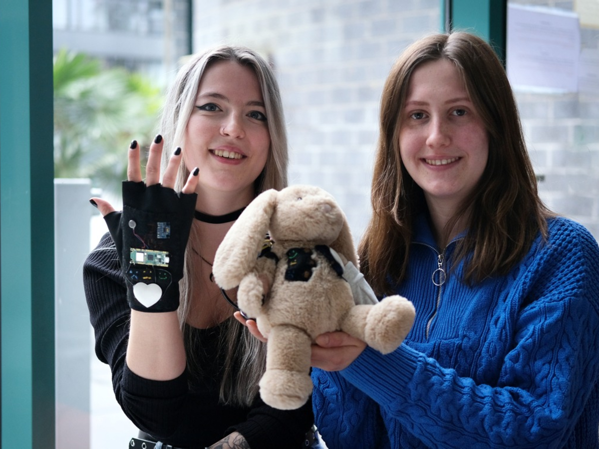 Unter Anleitung ihrer Betreuerin konzipierten die beiden Studentinnen daraufhin zum einen ein Kuscheltier, ĂŒber das Kinder Kontakt mit ihren Eltern aufnehmen können und zum anderen einen Handschuh, der das Kuscheltier steuern kann. "In der AusfĂŒhrung hatten wir sehr viele Freiheiten und konnten mitentscheiden, wie die Forschungsfrage angegangen werden soll. Zuerst haben wir uns damit beschĂ€ftigt, welche BedĂŒrfnisse ein neues GerĂ€t bei Eltern und Kindern erfĂŒllen mĂŒsste", sagt Sophie Kunz. In einer umfassenden Literatur-Analyse haben die beiden Studentinnen erarbeitet, dass Kinder vor allem etwas zum Anfassen brauchen, da selbst Videoanrufe noch sehr abstrakt fĂŒr sie sind. FĂŒr Eltern hingegen ist ein mobiles GerĂ€t am besten geeignet, damit sie etwa auch von Unterwegs mit ihren Kindern kommunizieren können. "Das Kuscheltier bietet den Kindern also ein StĂŒck weit einen Ersatz fĂŒr den physischen Kontakt mit den Eltern, wĂ€hrend der Handschuh fĂŒr die Erwachsenen ein tragbarer Kontaktpunkt mit ihren Kindern ist", erklĂ€ren die Studentinnen.
