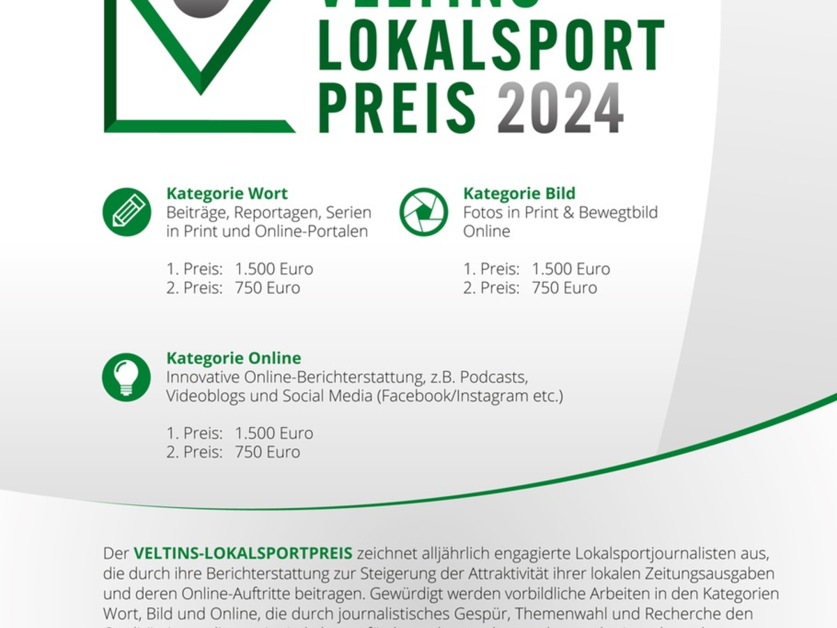 Jahr fĂŒr Jahr steht die Anerkennung engagierter Lokalsport-Journalisten im Fokus des Veltins-Lokalsportpreises. Angesprochen sind Redakteurinnen und Redakteure sowie Mitarbeitende lokaler und regionaler Zeitungen, die mit ihren Text-, Bild- und auch crossmedialen BeitrĂ€gen die attraktive Lokalsportberichterstattung garantieren. Es ist zu beachten, dass eingereichte Texte, BeitrĂ€ge und Bilder nicht durch KI oder KI-UnterstĂŒtzung generiert worden sein dĂŒrfen. Diese Regelung unterstreicht die AuthentizitĂ€t und menschliche KreativitĂ€t in den eingereichten Arbeiten. Die Einsendung der BeitrĂ€ge und Fotos ist weiterhin nur digital ĂŒber das Online-Bewerbungsportals unter www.lokalsportpreis.de/beitrag möglich. Bewertet werden von einer fĂŒnfköpfigen Jury die Einsendungen in den Kategorien Wort (BeitrĂ€ge, Reportagen, Serien in Print und Online-Portalen), Bild (Fotos in Print und Online sowie Bewegtbild in Online-Portalen) sowie Online (Innovative Online-Berichterstattung, z.B. Podcasts, Videoblogs, Social Media wie Facebook/Instagram/TikTok etc.). Zur Jury gehören: Ulrich Biene, Leiter Presse- und Ăffentlichkeitsarbeit der Brauerei C. & A. Veltins, Alfred BĂŒllesbach, M.A. VISUM Agentur fĂŒr Bildjournalismus und Fotodesign in MĂŒnchen, Ralf Leineweber, Chefredakteur der Celleschen Zeitung, Andreas Dach, Ressortleiter Lokalsport des Remscheider General-Anzeigers sowie Professor Christof Seeger, Studiendekan Master Crossmedia Publishing & Management / Vertiefungsrichtung Sport-kommunikation der Hochschule der Medien in Stuttgart.