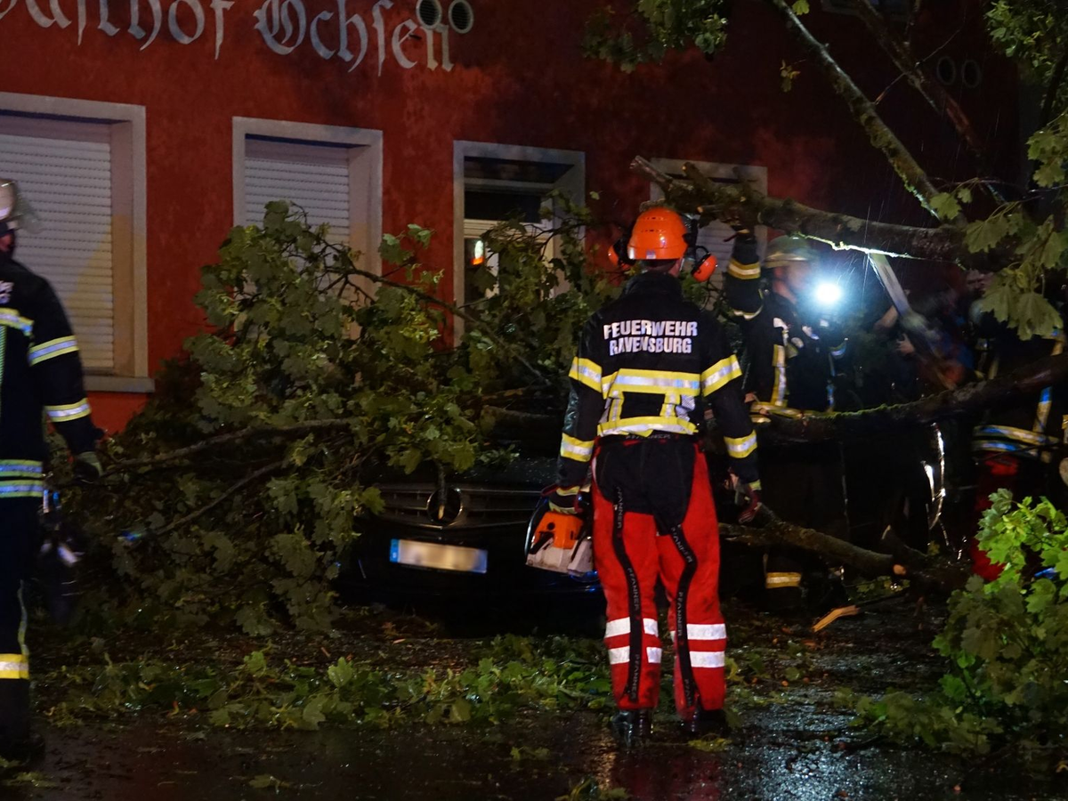 Auch in Baden-Württemberg wurden mehrere Menschen verletzt. So fiel etwa auf einem Campingplatz in Allensbach am Bodensee eine 70 Zentimeter dicke Eiche auf den Wohnwagen einer Familie - die drei Insassen und eine 30 Jahre alte Camperin kamen ins Krankenhaus. Im Landkreis Ravensburg wurde ein 53 Jahre alter Rollerfahrer lebensgefährlich verletzt, nachdem sein Fahrzeug mit einem auf der Straße liegenden Baum zusammengestoßen war. Eine 81-Jährige stürzte in Moos/Iznang durch den Dachboden, als sie vom Sturm gelöste Ziegel wieder befestigen wollte. Auch sie kam in ein Krankenhaus.