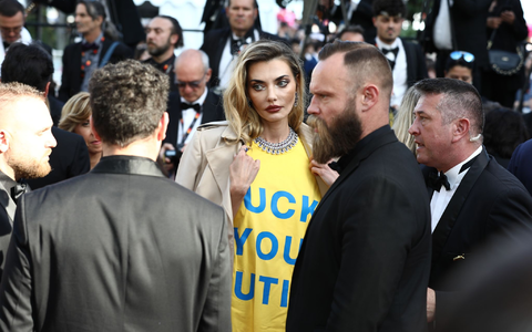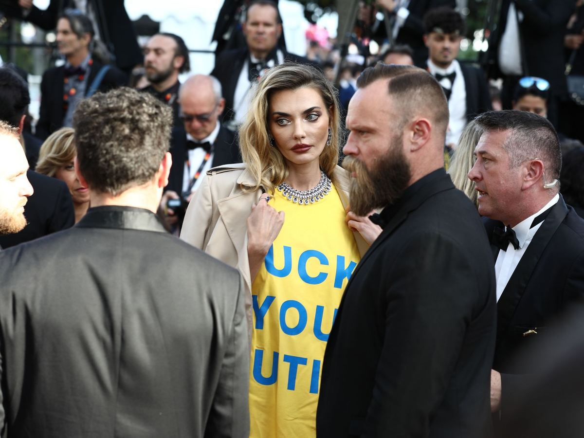 Zur Premiere des Dramas «The Old Oak» von Ken Loach kam sie in einem T-Shirt in den Landesfarben der Ukraine mit der Aufschrift: «Fuck you Putin». Am Samstag schrieb sie dazu auf Instagram, sie sei bei der Premiere tags zuvor vom Sicherheitspersonal gebeten worden, den Teppich zu verlassen, weil das Festival nicht politisch werden wolle. Sie habe ihre Jacke schließen müssen, um bleiben zu dürfen.