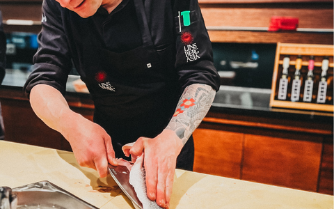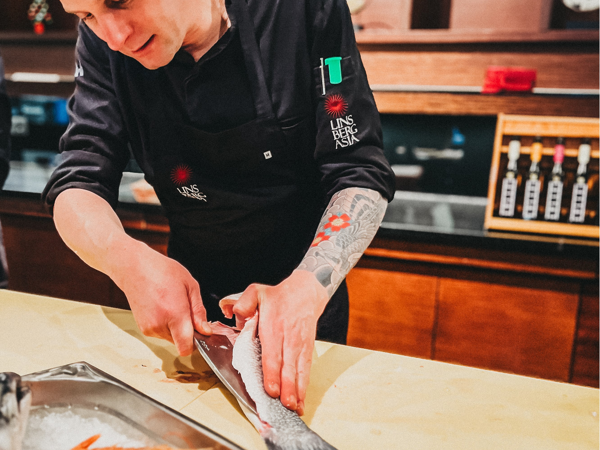 Küchenchef Michael Suttner und sein Team demonstrieren dabei präzise japanische Schneidetechniken und verarbeiten den Fisch direkt zu hochwertigen Sashimi- und Maki-Kreationen.