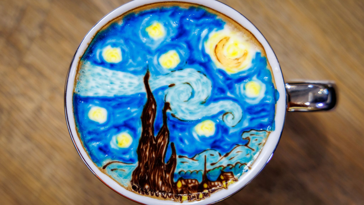 17.03.2025 - 06:31:37 | dpa.deEin Herz im Cappuccino-Milchschaum bekommt man in vielen Cafés. Wie wäre es stattdessen mit knalligen Mustern, einem Baum mit buntem Herbstlaub und Kunstwerken von Picasso oder Vincent van Gogh? Francesco Bozzato aus Bayreuth zaubert all diese Motive in Farbe auf den Cappuccino.
