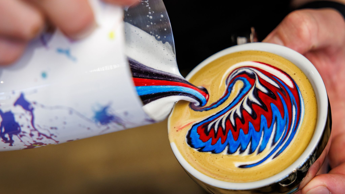 Für die Kunstwerke gibt der 23-Jährige die Farben in den Milchschaum und gießt diesen mit gekonnten Bewegungen auf den Kaffee. Bei manchen Motiven kommen aber auch Pinsel oder Farbflaschen mit feinen Spritzaufsätzen zum Einsatz.