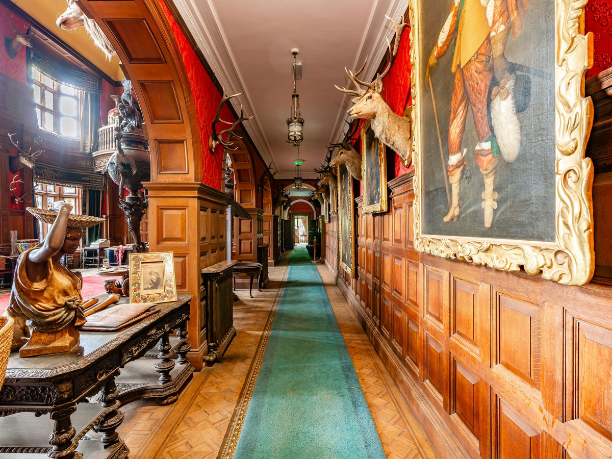 «Der Haupteingang wird über eine breite Steintreppe und von Bögen gesäumten Veranden erreicht. Die große Halle verfügt über große kuppelartige Erkerfenster, eine originale Holzvertäfelung und eine mit Balustraden eingefasste Galerie», heißt es in der Beschreibung auf der Webseite des Immobilienmaklers Savills.