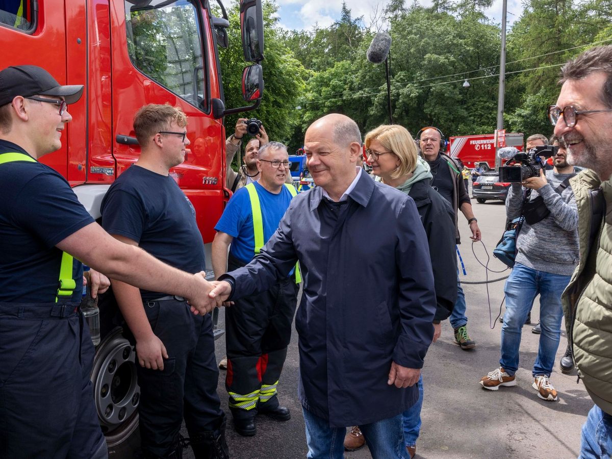 Scholz versicherte zudem noch im Saarland: «Wenn wir den Schaden besser besichtigen können und die unmittelbare Not- und Gefahrenlage zurückgegangen ist, dann wird es auch darum gehen, dass man miteinander verabredet, was zu tun ist, um denjenigen, die in Not geraten sind, zu helfen.» Michael Burkert, Präsident des saarländischen Landesverbandes des Deutschen Roten Kreuzes, erzählte dem Kanzler, dass man «aus dem Stand heraus» 400 freiwillige Helfer mobilisiert habe, auch aus Hessen und Rheinland-Pfalz.