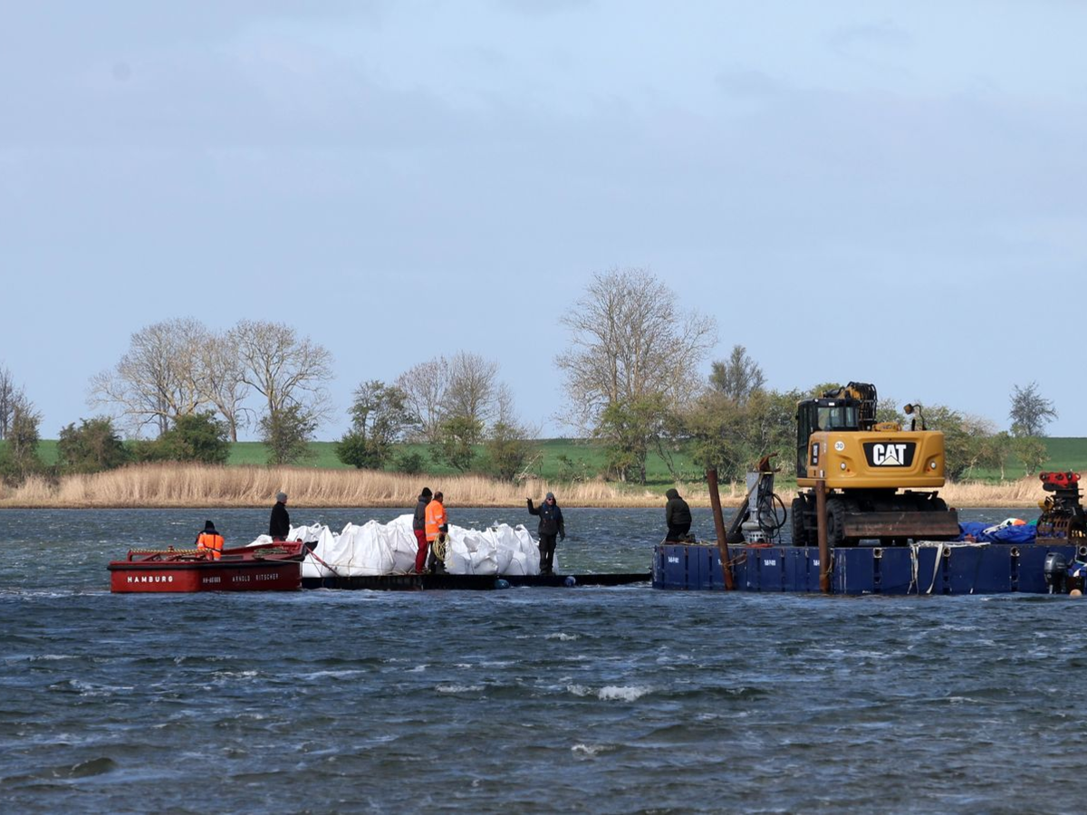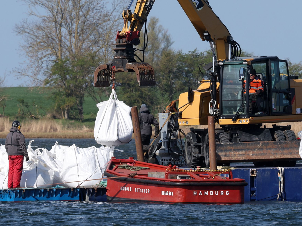 25.04.2026 - 13:01:27 | dpa.deAm Montag war der Buckelwal vor der Ostsee-Insel Poel nach kurzem Losschwimmen direkt erneut gestrandet - die Vorbereitungen zum Transport des zwölf Meter langen Meeressäugers laufen noch immer. Am Vormittag wurden rund 40 mit Sand gefüllte sogenannte Big Bags verladen und mit einem Schwimmponton in die Kirchsee-Bucht bugsiert. Dort wurden sie an Bord der großen verankerten Arbeitsplattform gehievt. Sie sollten als Barriere um den Wal gesetzt werden und verhindern, dass er sich bei steigenden Wasserständen noch weiter in die Flachwasserzone hinein bewegt.