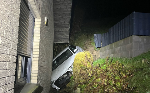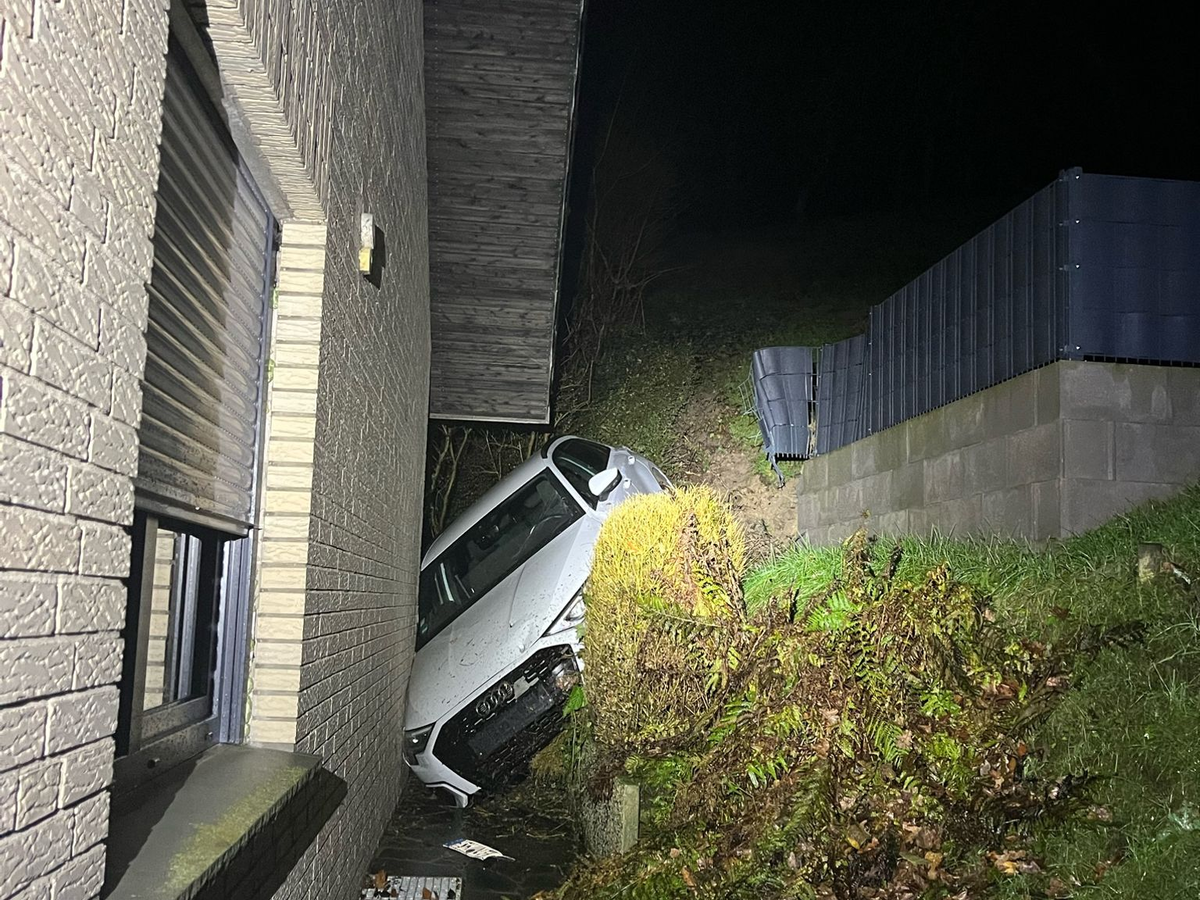 Auto klemmt zwischen Haus und Abhang