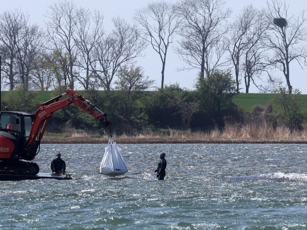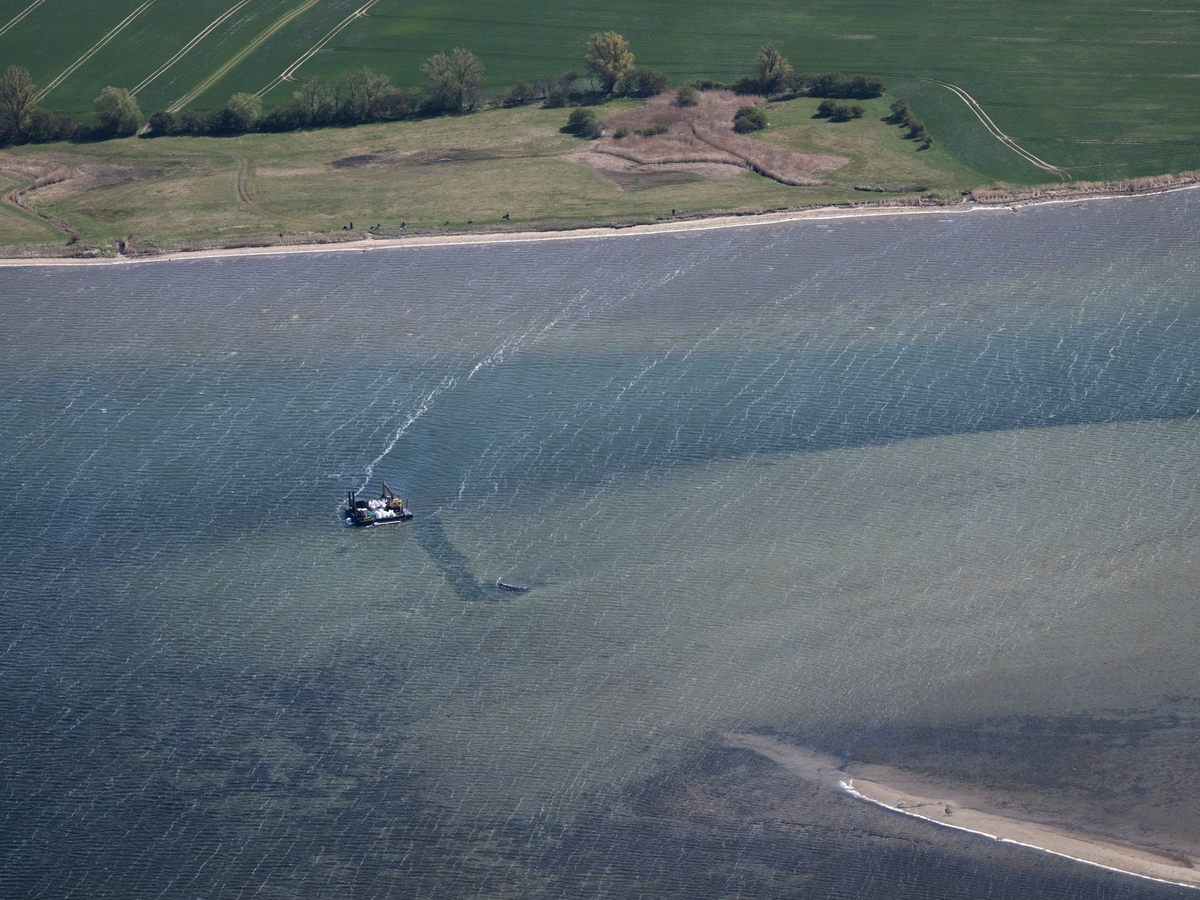 Am Vormittag waren rund 40 mit Sand gefüllte sogenannte Big Bags verladen und mit einem Schwimmponton in die Kirchsee-Bucht bugsiert worden. Dann wurde begonnen, sie am Wal zu platzieren. Als Barriere sollen sie verhindern, dass er sich bei steigenden Wasserständen noch weiter in die Flachwasserzone hinein bewegt. Am Sonntag sollte es höhere Wasserstände geben als in den Tagen zuvor. Schon einmal - am Montag - war das Tier bei steigendem Wasserstand plötzlich losgeschwommen.