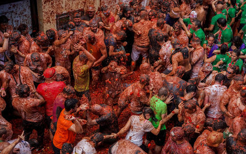 28.08.2024 - 15:56:53 | dpa.deRund 22.000 Menschen haben sich in Spanien eine verrückte Tomatenschlacht geliefert. Eine Stunde lang bewarfen sich die Teilnehmer in Buñol in der Region Valencia gegenseitig mit den überreifen und matschigen Früchten. Als Munition wurden insgesamt gut 120 Tonnen Tomaten benutzt, die nach Beteuerung der Organisatoren nicht mehr zum Verzehr geeignet waren. Laut dem Guinness-Buch der Rekorde handelt es sich um die größte Lebensmittelschlacht der Welt.
