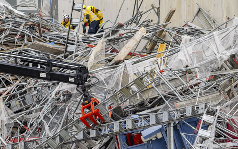 Die Polizei sperrte das Gebiet um die Unfallstelle weiträumig ab. Feuerwehr und Spezialfirmen waren im Einsatz, um die noch vorhandenen Gerüste an den drei anderen Seiten des 19-stöckigen Gebäudes zu sichern.