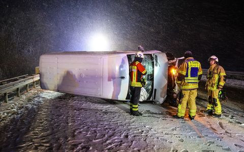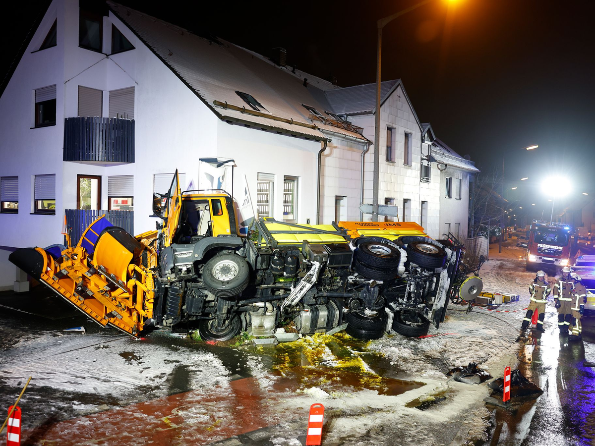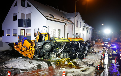 In Bayern kam ein Laster auf der A8 in Richtung München nahe Irschenberg bei Schneeglätte von der Fahrbahn ab und rutschte die Böschung hinab. Dabei verlor er fast seine ganze Ladung: 18.000 der 20.000 Liter flüssiger Kalk sickerten in den Boden, wie die Polizei mitteilte. In Mittelfranken geriet ein Schneepflug ins Schleudern und prallte gegen eine Hauswand.