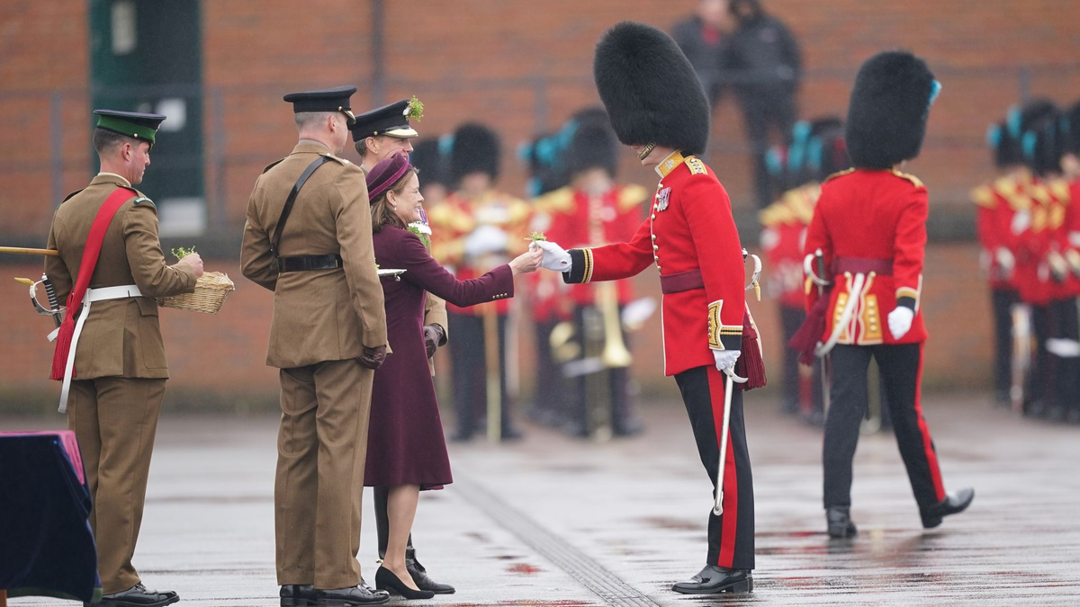 Die 42-JĂ€hrige konnte im Gegensatz zum Vorjahr nicht selbst teilnehmen, weil sie sich noch bis nach Ostern von einer Bauch-Operation erholt. In Vertretung von Kate ĂŒbergab die Ehefrau von Regimentschef Generalmajor Christopher Ghika dem dreijĂ€hrigen Seamus das traditionelle Kleeblatt. Die Infanterietruppe war 1900 von Queen Victoria gegrĂŒndet worden und ist eines von fĂŒnf Leibregimentern des Königs.