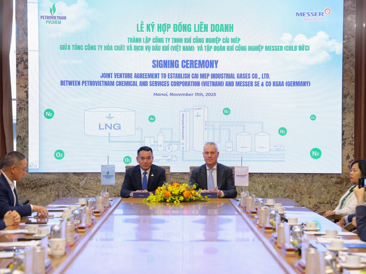 11.11.2025 - 14:24:31 | presseportal.dePetrovietnam Chemical and Services Corporation (PVChem), ein Mitglied der Vietnam National Industry and Energy Group (Petrovietnam), und der deutsche Industriegasespezialist Messer SE & Co. KGaA haben einen Joint-Venture-Vertrag zur Gründung der Cái Mép Industrial Gases Co. Ltd. unterzeichnet. Das Joint Venture wird in die Entwicklung einer Industriegasproduktionsanlage im Cái Mép Industrial Park, Cái Mép Ward, Ho-Chi-Minh-Stadt, mit einer Kapazität von 200.000 Tonnen pro Jahr und einer Gesamtinvestition von rund 35 Millionen US-Dollar investieren. Der Baubeginn ist für Ende 2026 vorgesehen, die kommerzielle Inbetriebnahme für Ende 2028.