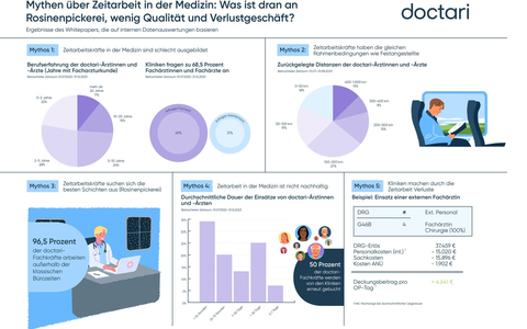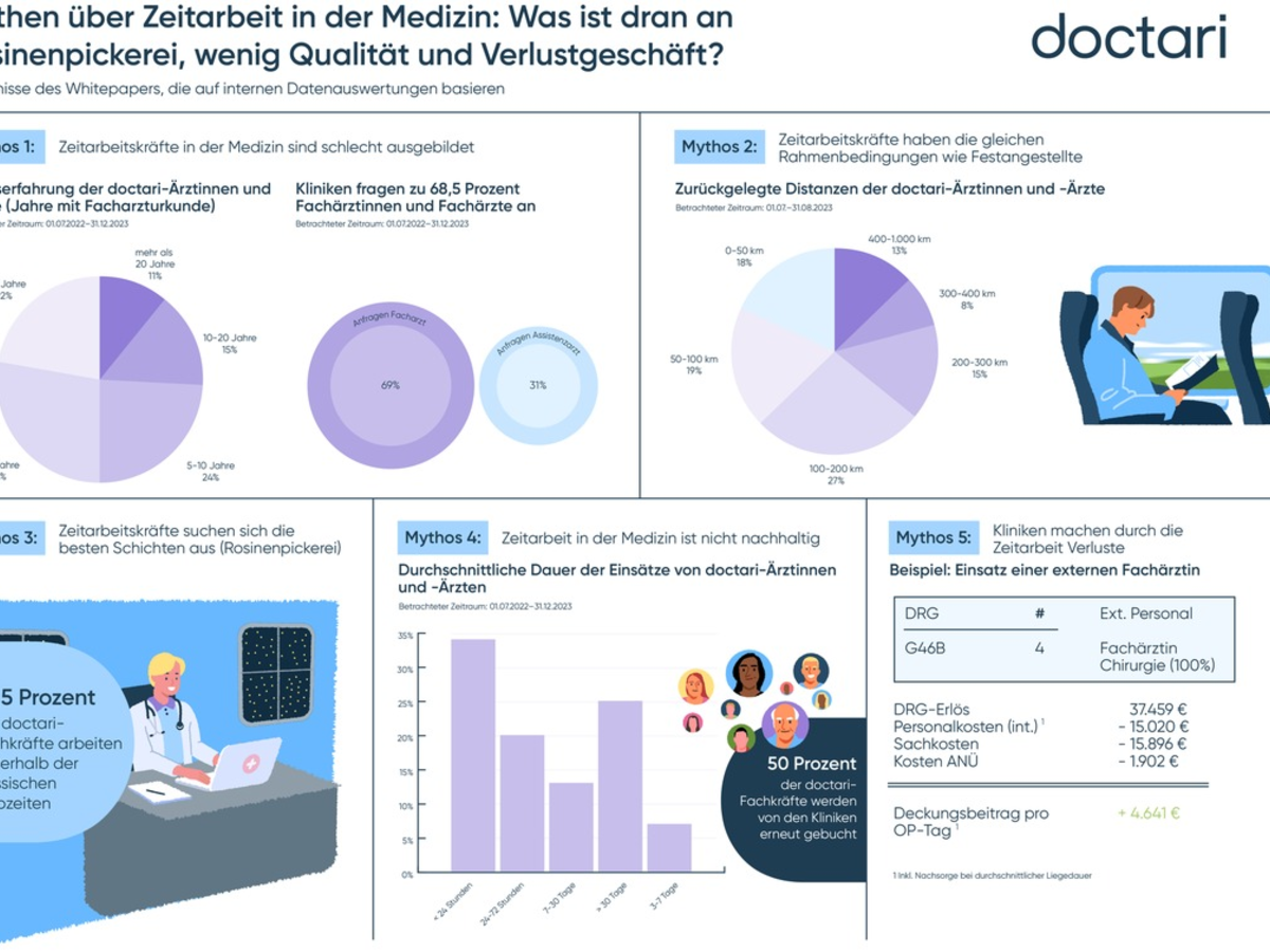 Für das Whitepaper "Mythen der Zeitarbeit" wurden landesweit die Daten von insgesamt 50.000 Ärztinnen, Ärzten und 32.000 Pflegefachkräften unterschiedlicher Fachrichtungen in verschiedenen Positionen ausgewertet (Zeitraum: 01.07.2022 bis einschließlich 31.12.2023). Die vollständige Erhebung finden Sie unter folgendem Link: https://www.doctari.de/mythen-zeitarbeit