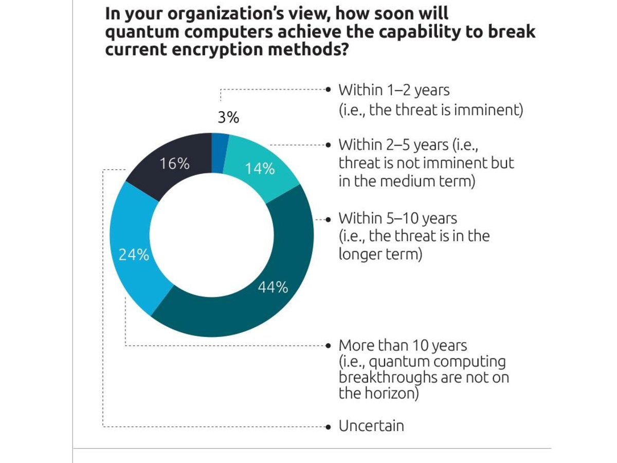 Der Studie zufolge zeigen sich rund zwei Drittel (65 Prozent) der befragten Unternehmen besorgt über die zunehmende Bedrohung durch "Harvest-now, decrypt-later"-Angriffe. Jedes sechste "Early-Adopter"-Unternehmen geht davon aus, dass der "Q-Day" innerhalb der nächsten fünf Jahre eintritt, während rund sechs von zehn mit einem Zeitraum von zehn Jahren rechnen.