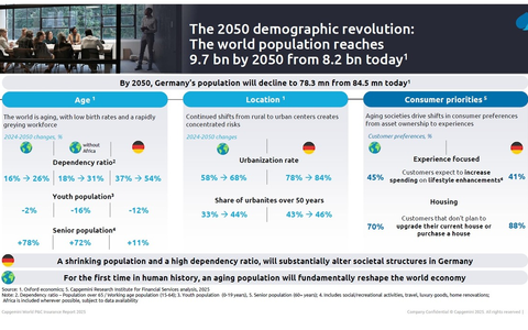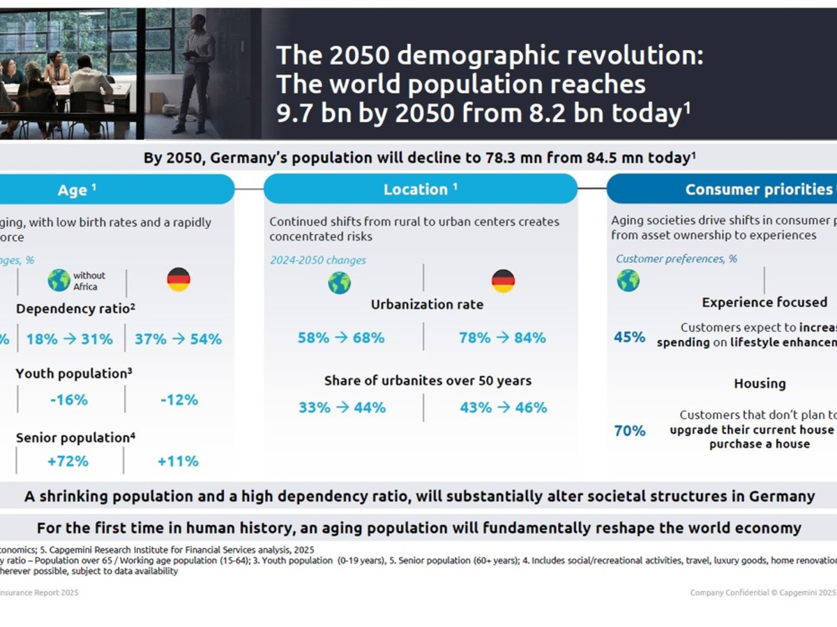 Berlin - Der World Property and Casualty Insurance Report des Capgemini Research Institute zeigt, wie die alternde Weltbevölkerung die Versicherungsbranche bis 2050 weltweit transformieren wird. Die Studie beschreibt, wie sich der Anteil von Senioren im VerhĂ€ltnis zu ErwerbstĂ€tigen verĂ€ndern wird und welche entscheidenden Auswirkungen das auf Verbrauchsgewohnheiten, MobilitĂ€t und Technologieanwendungen hat - mit weitreichenden Konsequenzen fĂŒr gewerbliche und private Schaden- und Unfallversicherungen (P&C). Diese Trends treiben die Branche hin zu prĂ€ventionsorientierten, modularen AnsĂ€tzen mit Echtzeit-Risikomonitoring sowie stĂ€rker technologiegestĂŒtzten Underwriting-Modellen.