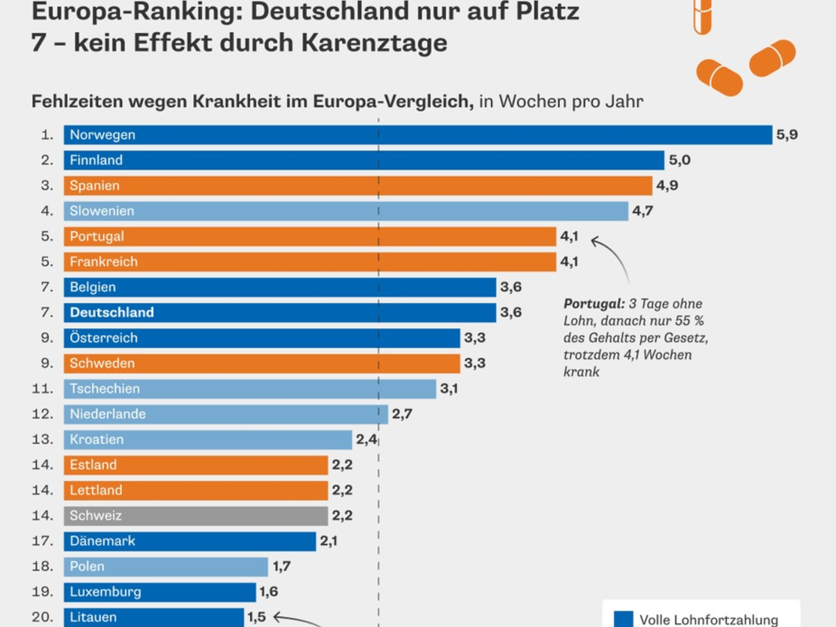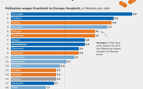 Mit 3,6 Wochen Krankenzeit pro Jahr liegen deutsche BeschĂ€ftigte zwar ĂŒber dem europĂ€ischen Durchschnitt von 2,6 Wochen. Doch von einer Sonderstellung kann keine Rede sein: Finnland verzeichnet 5 Wochen, Norwegen fast sechs.