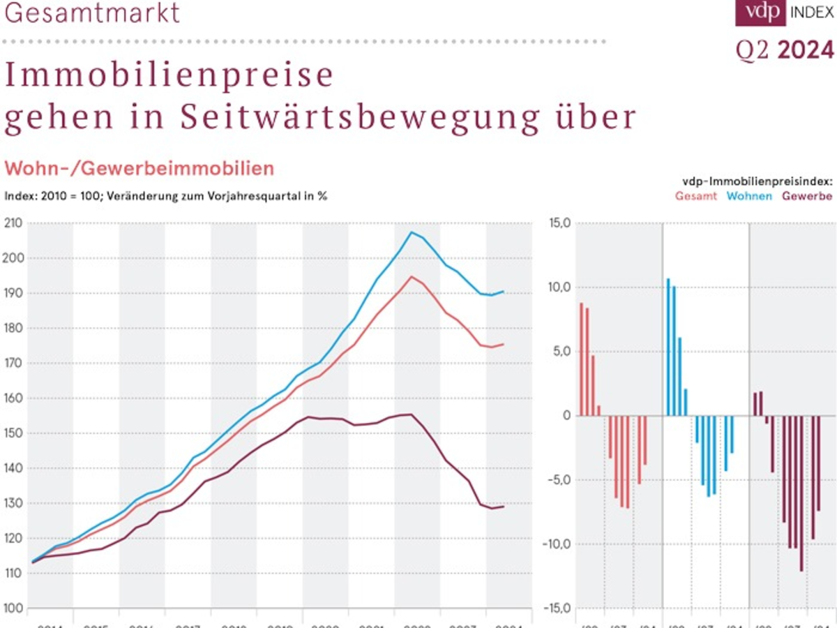 Immobilienpreise gehen in Seitwärtsbewegung über / vdp-Index auf Jahressicht weiter im Minus, auf Quartalssicht erstmals wieder leicht im Plus