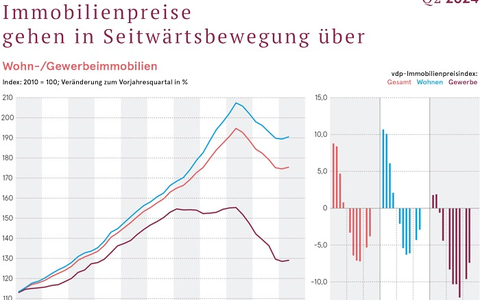 Abschließend blickte der vdp-Hauptgeschäftsführer voraus: "Nach zwei Jahren des Abschwungs scheint das weitere Rückschlagpotenzial inzwischen begrenzt zu sein." Angesichts der bestehenden externen Risikofaktoren wie Geopolitik und Wirtschaftswachstum sei zwar nicht auszuschließen, dass in den nächsten Quartalen teilweise nochmals Rückgänge zu verzeichnen seien, aber tendenziell werde sich die jetzt schon erkennbare Seitwärtsbewegung der Immobilienpreise im nächsten Jahr manifestieren, bei den Wohnimmobilienpreisen schneller als bei den Gewerbeimmobilienpreisen. "Es ist noch deutlich zu früh, eine Trendumkehr auszurufen, aber eine Entspannung der schwierigen Lage zeichnet sich ab."