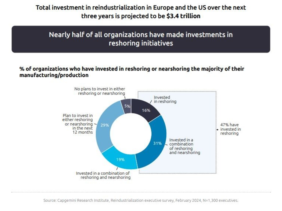 Investitionen in die RĂŒckverlagerung der Produktion in den Heimatmarkt (Reshoring), in ein nahe gelegenes Land (Nearshoring), in die inlĂ€ndische Produktion sowie in den Bau oder die Modernisierung von Produktionsanlagen nehmen in Europa und den USA zu. Ziel ist es, sich widerstandsfĂ€higer gegen Störungen aufzustellen. Der GroĂteil dieser Mittel flieĂt in Initiativen fĂŒr den Markt, in dem die Unternehmen heimisch sind.