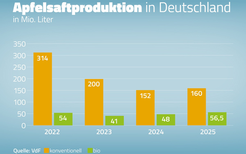 Keltersaison 2025 / Niedrige Apfelsaftmenge mit hohem Bio-Anteil zu hohen Preisen gekeltert