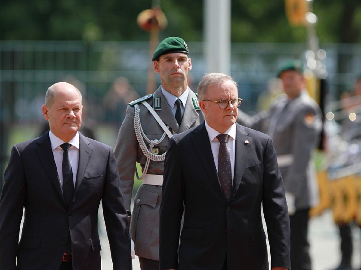 Unternehmen aus beiden Ländern sollten vor allem ihre Zusammenarbeit bei der Produktion und dem Transport von "grünem Wasserstoff" weiter vertiefen, so Scholz. Das sei ein "wichtiger Beitrag für Klimaneutralität". Auch sonst fasse man eine engere Zusammenarbeit ins Auge: "Bei Fragen der wirtschaftlichen Sicherheit, Diversifizierung und der Resilienz von Lieferketten haben wir heute miteinander vereinbart, noch stärker zu kooperieren", sagte der Kanzler. Die Zusammenarbeit beider Volkswirtschaften beim Aufbau von Lieferketten für kritische Mineralien und Rohstoffe werde man weiter vertiefen. "Eine gemeinsame Studie wird konkrete Möglichkeiten der Zusammenarbeit identifizieren und untersuchen, wie wir dabei höchste soziale und ökologische Standards in einem regelbasierten Handelssystem umsetzen können", so der Kanzler. Albanese hob unterdessen unter anderem die Bedeutung eines Freihandelsabkommens zwischen der EU und Australien hervor. Offiziell standen bei dem Treffen von Scholz und Albanese am Montag bilaterale, regionale und internationale Themen im Mittelpunkt. Nach dem Willen der Bundesregierung soll Australien als wichtiger Partner in der Indopazifik-Region dazu beitragen, die Abhängigkeiten von China zu verringern. Eine Vertiefung der Beziehungen wurde zuletzt bereits in mehreren Bereichen diskutiert, darunter sowohl die Zusammenarbeit in der Sicherheitspolitik als auch die Bewältigung der Energiewende. Unter anderem wurde am Montag ein Grundsatzabkommen unterzeichnet, wonach Australien Deutschland mehr als 100 Radspähpanzer vom Typ Boxer liefern wird. Albanese sprach in diesem Zusammenhang von einem der größten Rüstungsgeschäfte in der Geschichte Australiens.