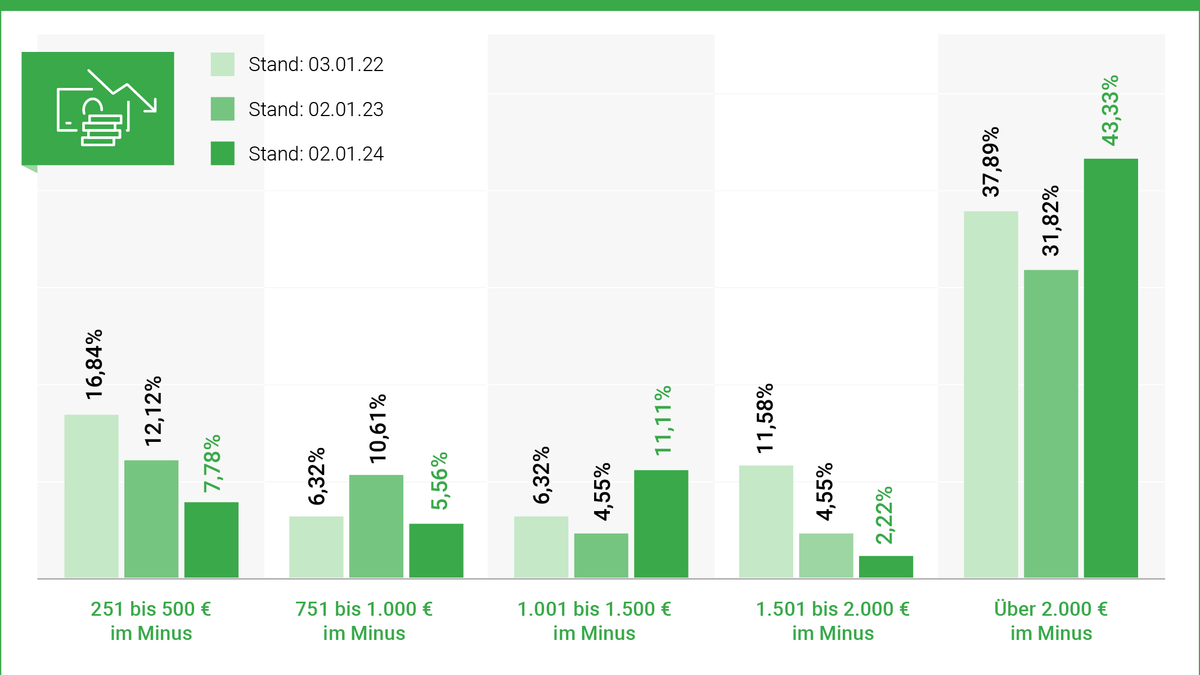 Während Anfang 2022 noch 16,84 % der Kontoinhaber im Minusbereich von 251 bis 500 Euro lagen, sank dieser Anteil bis Anfang 2024 auf 7,78 %. Diese Entwicklung deutet darauf hin, dass sich immer mehr Menschen auf höhere Überziehungssummen einlassen. Besonders auffällig ist der Anstieg bei den Überziehungen von mehr als 2.000 Euro. Anfang 2022 lag der Anteil noch bei 31,82 %, stieg jedoch bis Anfang 2024 auf besorgniserregende 43,33 % an.