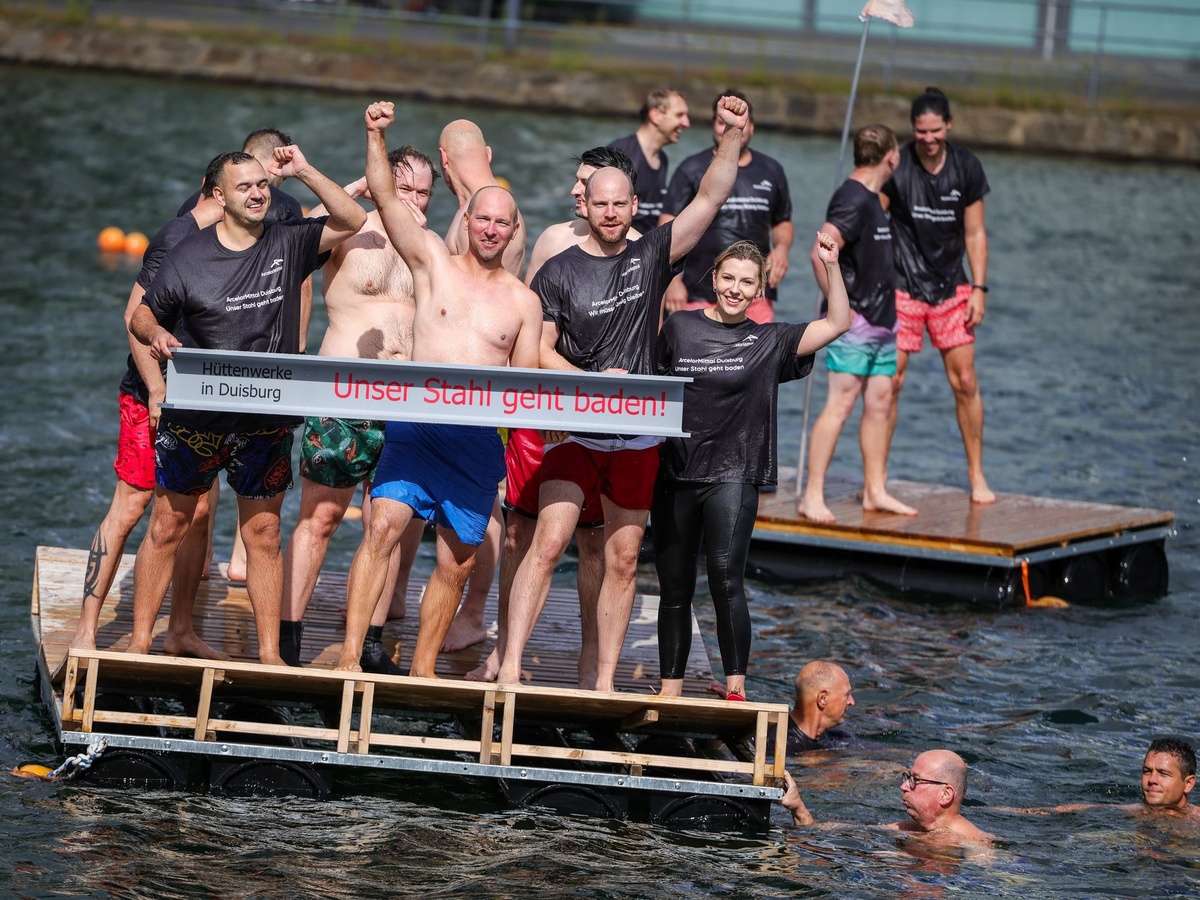 Mit einer spektakulären Aktion im Duisburger Innenhafen haben Beschäftigte des Stahlkonzerns Arcelormittal für den Erhalt ihrer Arbeitsplätze demonstriert und Investitionen in den Duisburger Standort gefordert. Unter dem Motto «Unser Stahl geht baden» sprangen rund 60 Stahlarbeiter von der Kaimauer ins Hafenbecken. An einer parallelen Kundgebung nahmen nach Angaben der IG Metall mehr als 550 Beschäftigte teil, darunter auch Mitarbeiter der Stahlunternehmen HKM und Thyssenkrupp Steel. Arcelormittal stellt in Duisburg unter anderem Draht für die Autoindustrie und den Maschinenbau her und beschäftigt laut IG Metall rund 850 Menschen.