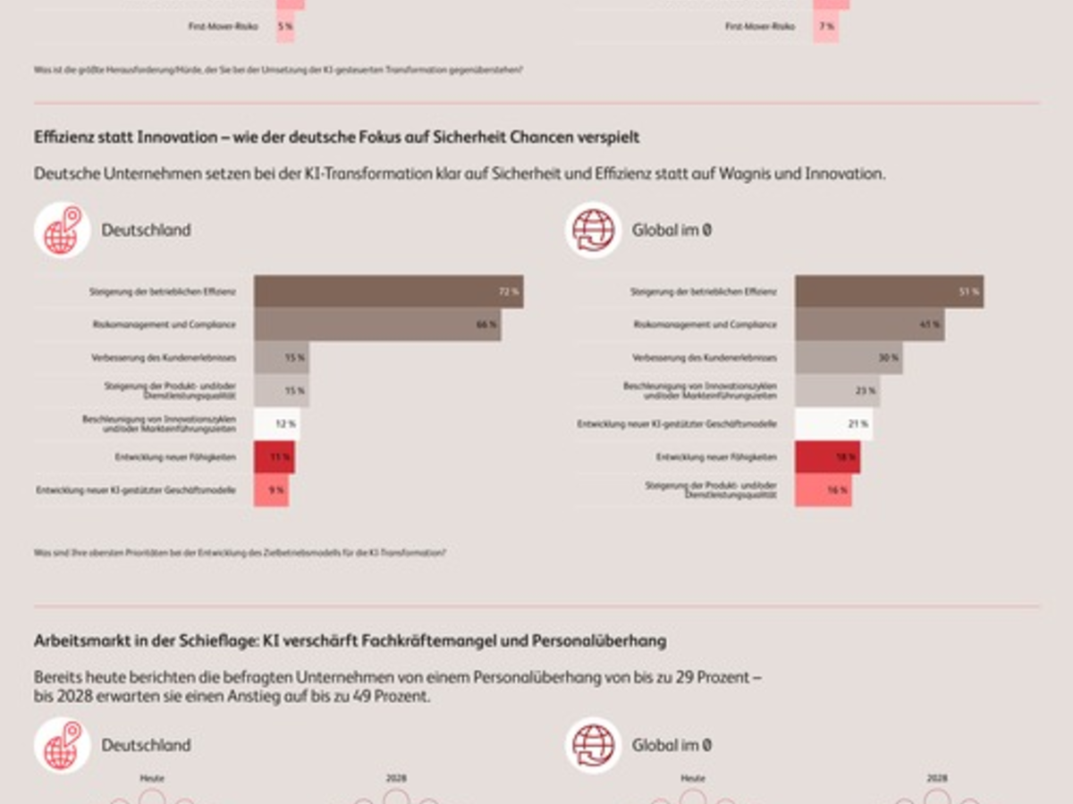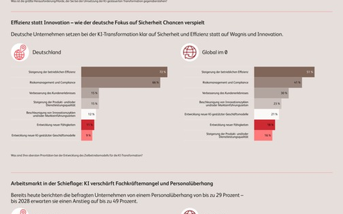 Deutsche Unternehmen setzen bei der KI-Transformation klar auf Sicherheit und Effizienz statt auf Wagnis und Innovation. 72 Prozent nennen Effizienz als Hauptziel - deutlich mehr als im weltweiten Durchschnitt (51 Prozent). Auch Compliance steht hierzulande weit oben auf der Agenda (66 Prozent gegenüber 41 Prozent international). Wenn es jedoch um Innovation und neue Geschäftsmodelle geht, zeigt sich Zurückhaltung: Nur 12 Prozent verfolgen mit KI das Ziel, Innovationen voranzutreiben (weltweit: 23 Prozent) und lediglich 9 Prozent planen, mit der Technologie neue Geschäftsmodelle zu erschließen (weltweit: 21 Prozent).