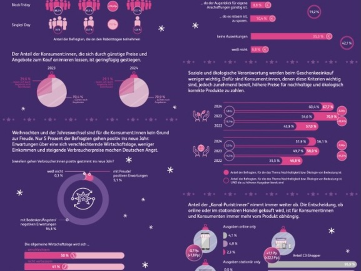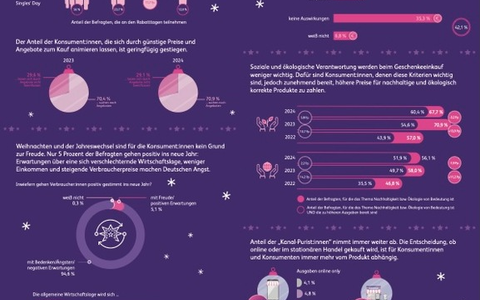 Dieser vermeintliche Widerspruch hat unterschiedliche Gründe: Knapp 14 Prozent der Befragten planen, dieses Jahr mehr für Geschenke auszugeben, um sich nochmal großzügig zu zeigen (2023: 13 Prozent). Weitere 14 Prozent machen dieses Jahr mehr Geschenke, da sie befürchten, aufgrund ihrer persönlichen finanziellen Lage im kommenden Jahr weniger Geld dafür zur Verfügung zu haben (2023: 9 Prozent). 11 Prozent halten den Augenblick gerade für günstig, um Produkte aufgrund von erwarteten Preissteigerungen im Jahr 2025 jetzt zu kaufen (2023: 0,4 Prozent).