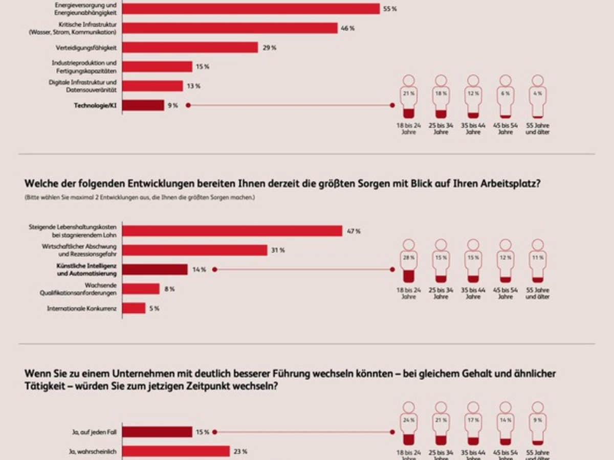 Das deutet darauf hin, dass jüngere Beschäftigte den Arbeitsmarkt aktuell als deutlich instabiler wahrnehmen und Risiken stärker abwägen. Bemerkenswert ist zudem: Die jüngste Altersgruppe sorgt sich im Vergleich weniger um klassische Wohlstandsthemen wie Lebenshaltungskosten oder Konjunktur, dafür aber überdurchschnittlich stark um technologische Umbrüche und Qualifikationsanforderungen.