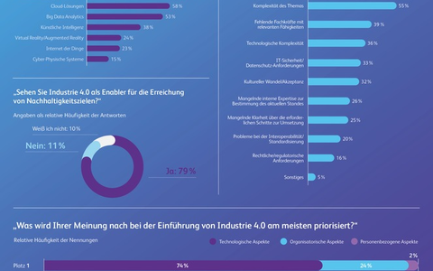 Großes Potenzial haben die digitalen Technologien im Hinblick auf den Umweltschutz. Dies bestätigen auch die Befragten: 79 Prozent sehen die Industrie 4.0 und ihre Technologien als Wegbereiter für die Erreichung von Nachhaltigkeitszielen. Vor allem die höhere Transparenz in den Unternehmensprozessen kann eine Entwicklung der Produktion hin zu mehr Nachhaltigkeit fördern. Beispiele sind die kosten- und energieeffiziente Steuerung der Fabrik durch das Sammeln von Echtzeit-Informationen über den Energieverbrauch oder der Einsatz von digitalen Zwillingen in der Lieferkette, um effiziente und ressourcenschonende Logistikströme zu ermöglichen.