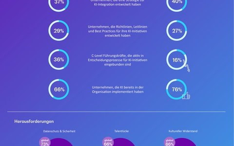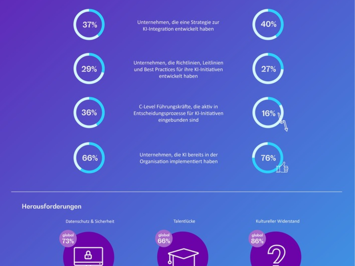 150 Studienteilnehmerinnen und -teilnehmer aus Deutschland lieferten umfassende Einblicke in die Positionierung des Landes im internationalen Vergleich. Mit 76 Prozent übertrifft Deutschland den globalen Durchschnitt bei der KI-Implementierung in Unternehmen. Dennoch ist diese technologische Führungsrolle gefährdet: 60 Prozent der deutschen Unternehmen haben laut Umfrage noch keine fundierte Strategie für den Einsatz von KI entwickelt, um den langfristigen Erfolg ihrer Initiativen zu sichern. Dies könnte das Wachstumspotenzial erheblich beeinträchtigen und den technologischen Vorsprung gefährden. Zudem haben lediglich 27 Prozent der Unternehmen in Deutschland umfassende Richtlinien, Leitlinien und Best Practices für ihre KI-Initiativen etabliert. Dies verdeutlicht, dass viele Unternehmen ihre KI-Projekte ohne klare strategische Vorgaben umsetzen, was langfristig zu Ineffizienzen, rechtlichen Risiken und Problemen bei der Skalierbarkeit führen kann.