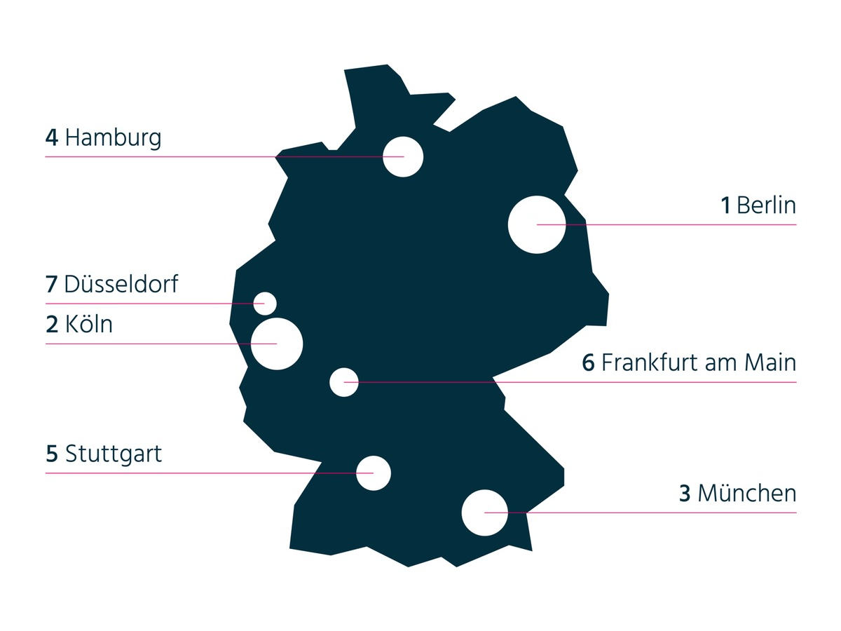 Abgeschlagen auf dem sechsten Platz liegt Frankfurt am Main. Der Büromarkt des Finanzzentrums wird überwiegend durch Corporates geprägt und kann trotz der räumlichen Nähe zu großen Server-Zentren keine flächendeckende New-Work-Readiness vorweisen. Das macht sich mitunter in einer vergleichsweise geringen Back-to-Office-Quote bemerkbar. Hier belegt Frankfurt den letzten Platz. Die Städte Düsseldorf (7) und Stuttgart (5) stechen durch ihre starke Wirtschaftsstruktur hervor, die vor allem durch viele ältere Unternehmen und den Wirtschafts-Boom in den 60er/70er-Jahren geprägt ist, was sich sowohl in der Infrastruktur als auch im Immobilienbestand widerspiegelt.