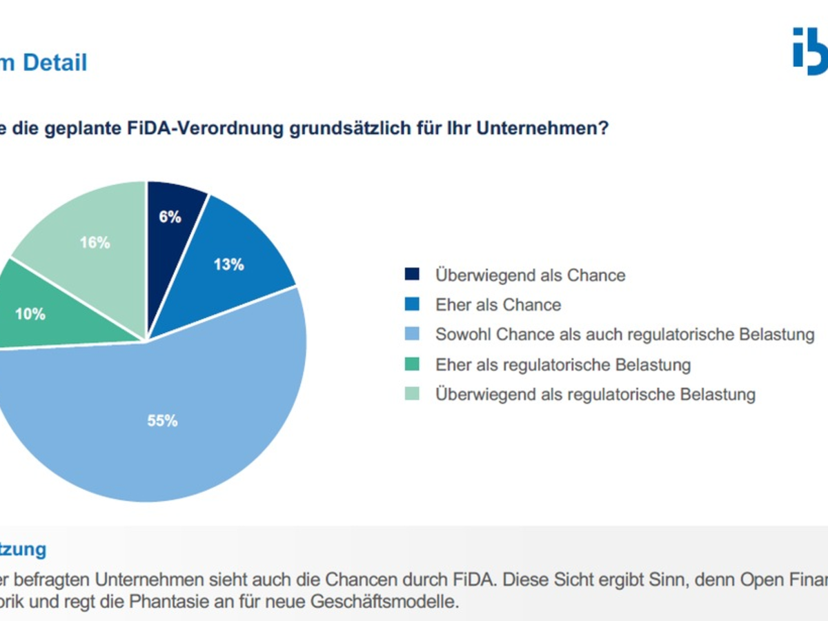 Die FiDA-Verordnung soll den autorisierten Zugang Dritter zu Finanzdaten von Privatkunden regeln. WĂ€hrend jeder sechste der Befragten die Verordnung ĂŒberwiegend als regulatorische Belastung bewertet, sehen drei Viertel der Teilnehmenden eine Chance fĂŒr das eigene Unternehmen.